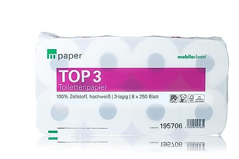 Toilettenpapier TOP³ 3-lagig hochweiß 9,5cmx11cm (8 Rollen à 250 Blatt)